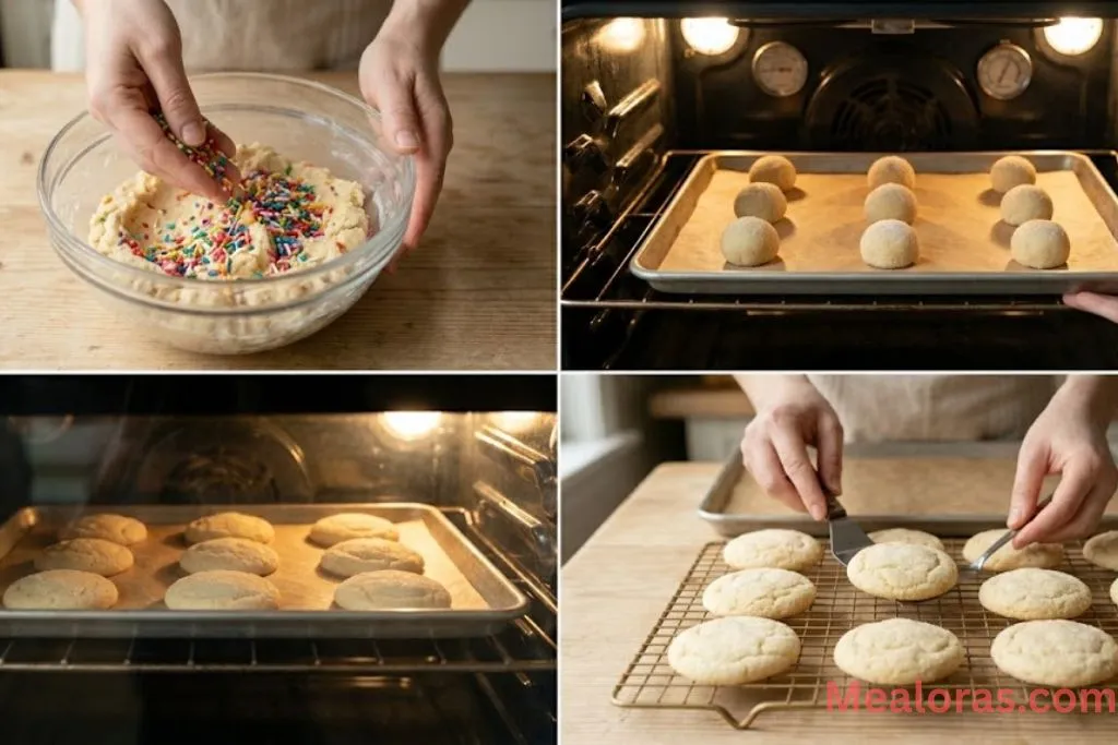 Turn the mixer to low speed and gradually add the dry flour mixture. If using sprinkles, toss them in now. Mix until the flour just disappears. The dough should be soft and scoopable. If it feels too oily or loose, a small tablespoon of extra flour can be added, but be careful not to overmix.